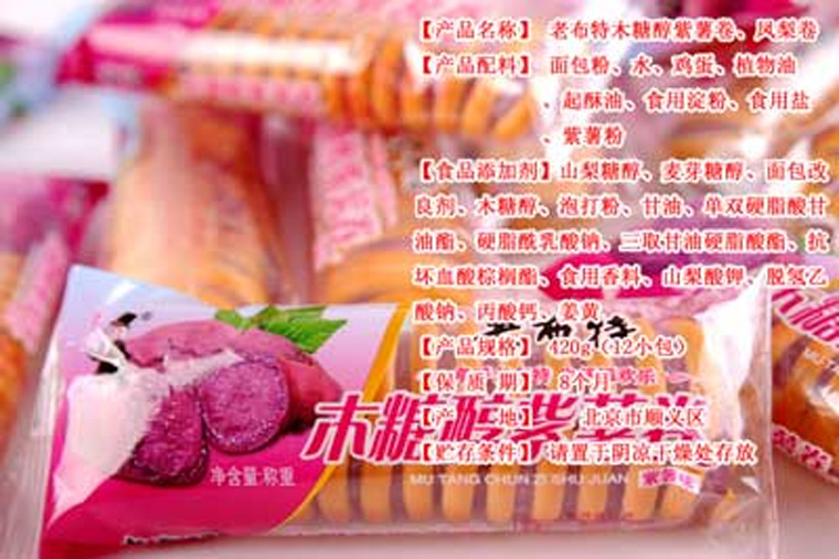 | 厂家联系方式: | 配料表: | 面包粉、水、鸡蛋、植物油、起酥油、食用淀粉、食用盐、紫薯粉、低聚异麦芽糖、酵母、食用酒精 | |