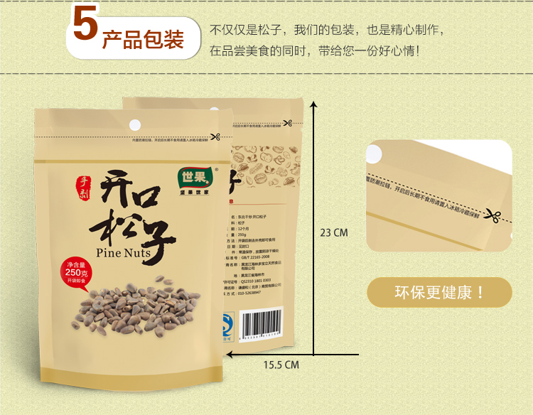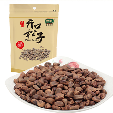 【品名】:东北干炒开口松子【品牌】:世果【保质期】:12个月【净含量】:250g【食用方法】:开袋后剥去外壳即可食用【贮存条件】:常温保存,放置阴凉干燥处 |