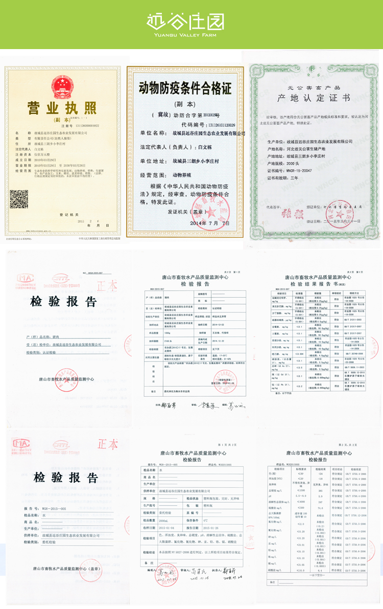 | 动物防疫条件合格证: | 131126101120029 | 厂名: | 北京远谷庄园生态农业发展有限公司 |