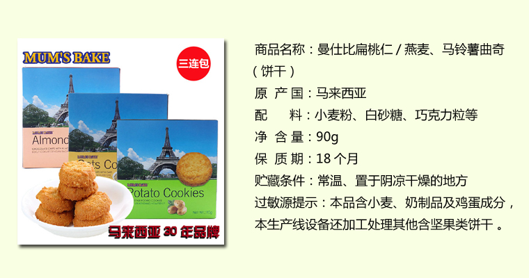 | 配料表: | 小麦粉 白砂糖 扁桃仁 人造奶油 巧--- | 商品条形码: | 9556296314143 |