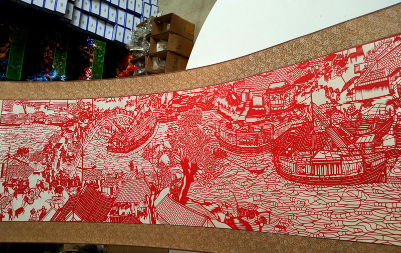 清明上河图横幅作品,画面取清明上河图整幅作品其中一段。剪纸制作费工,装裱也有难度,都是找经验丰富的工人进行装裱,整体作品出来大气磅礴。喜欢的就收一副。