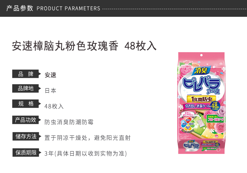 日本安速抽屉 消臭防霉防潮防变黄防虫樟脑丸 粉色玫瑰香 48枚入