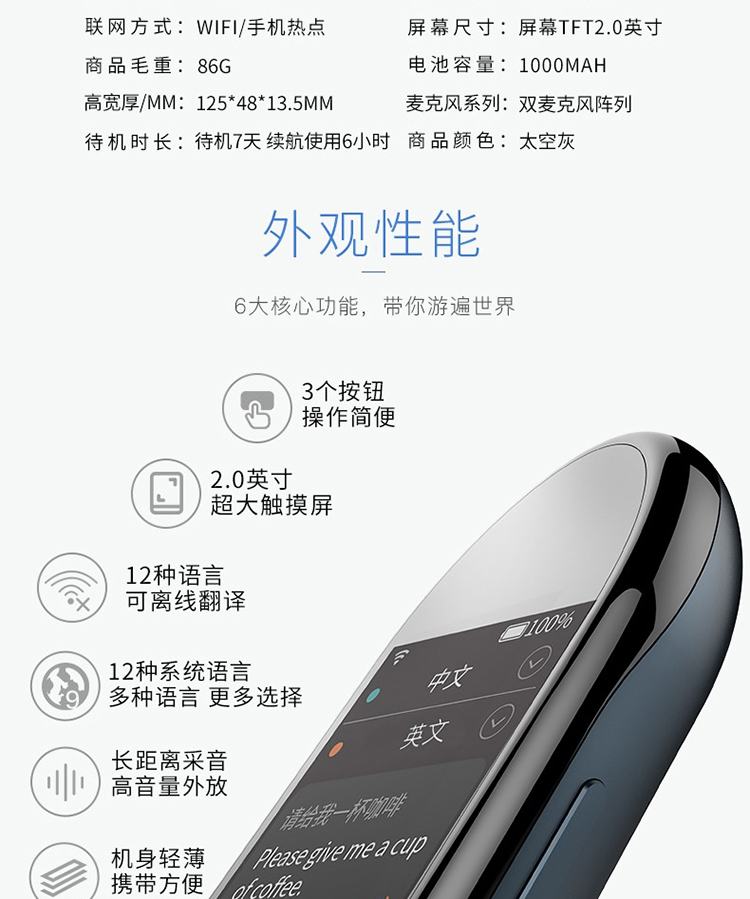 悦译智能翻译机PRO2.0 电池容量:1000mAh