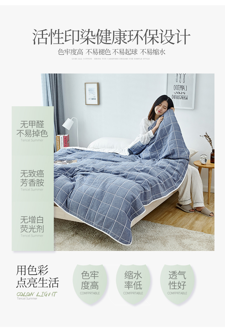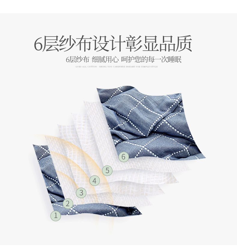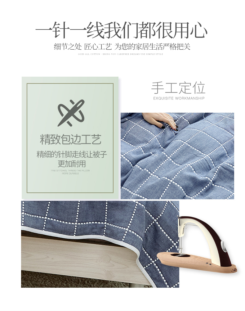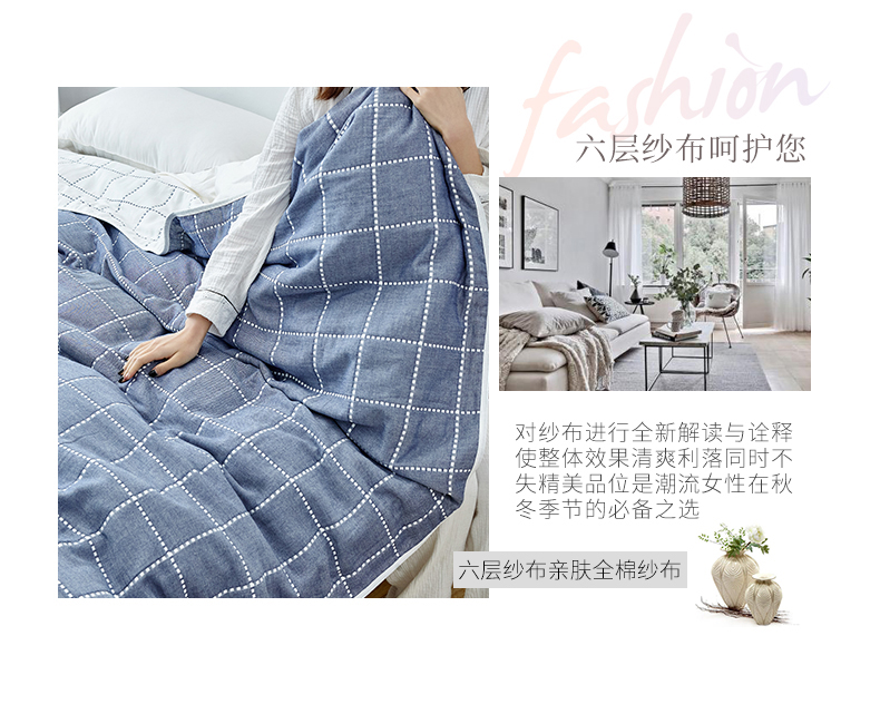 遇洁轩全棉A类六层纱布毛巾被 午睡被 90x100cm(格子蓝)