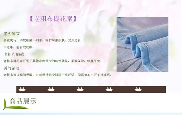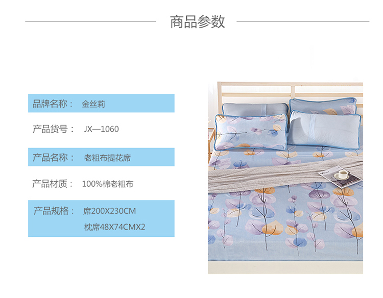 您所在的位置:首页 > 家居日用 >  床上用品 >  席子 >  金丝莉老粗布提花席JX-1060 三件套席200×230cm枕席48×74cm×2