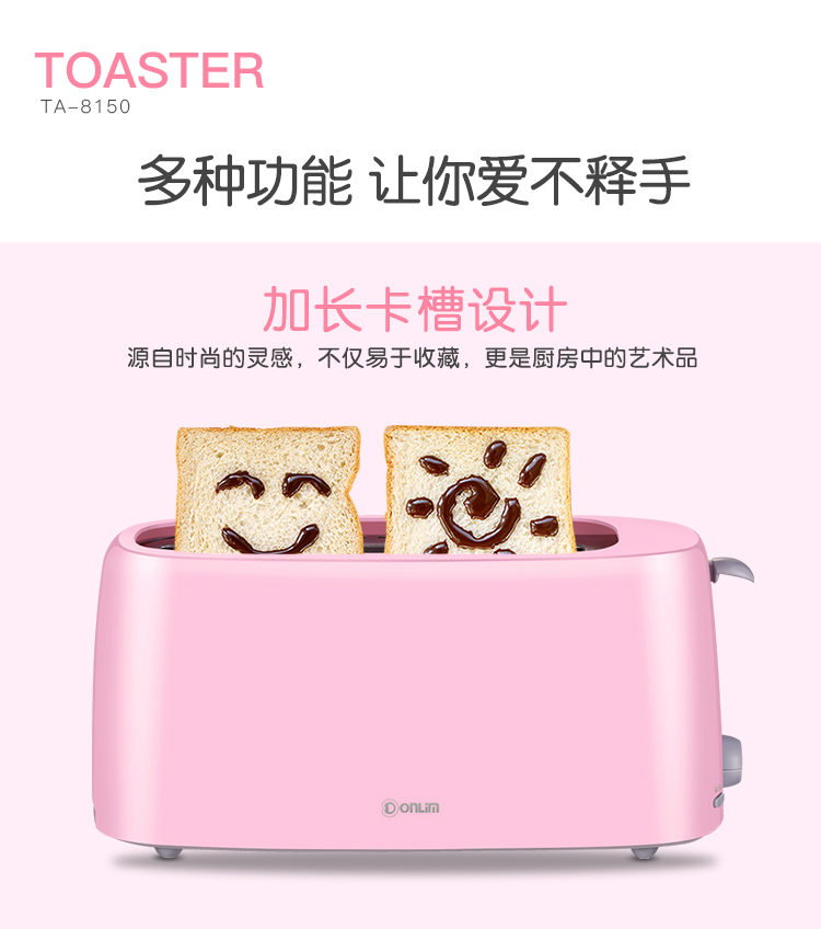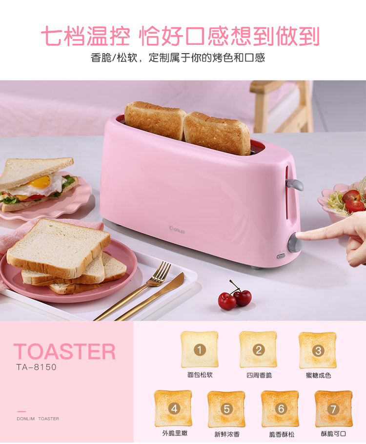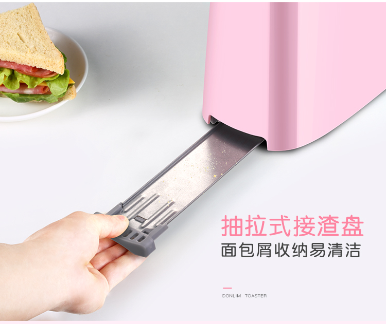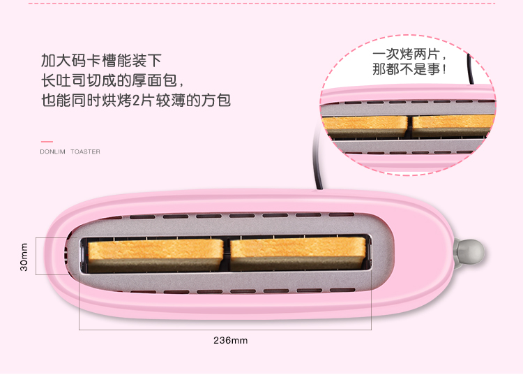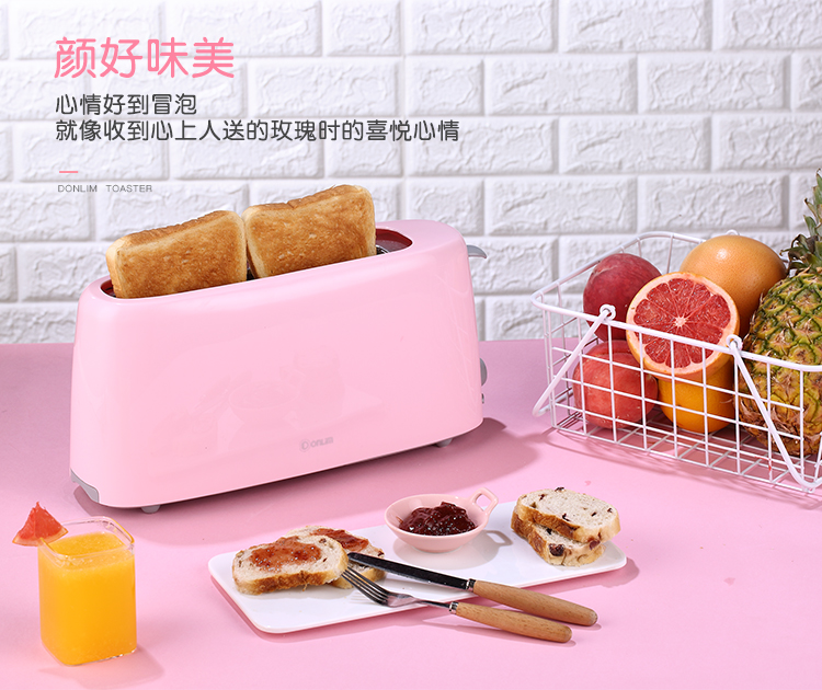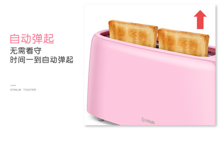东菱Donlim多士炉2片懒人烤面包机家用智能全自动双面烘烤早餐机吐司机迷你机 加长卡槽(粉色)
