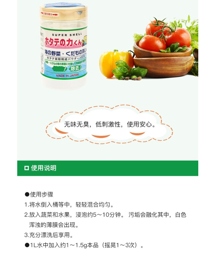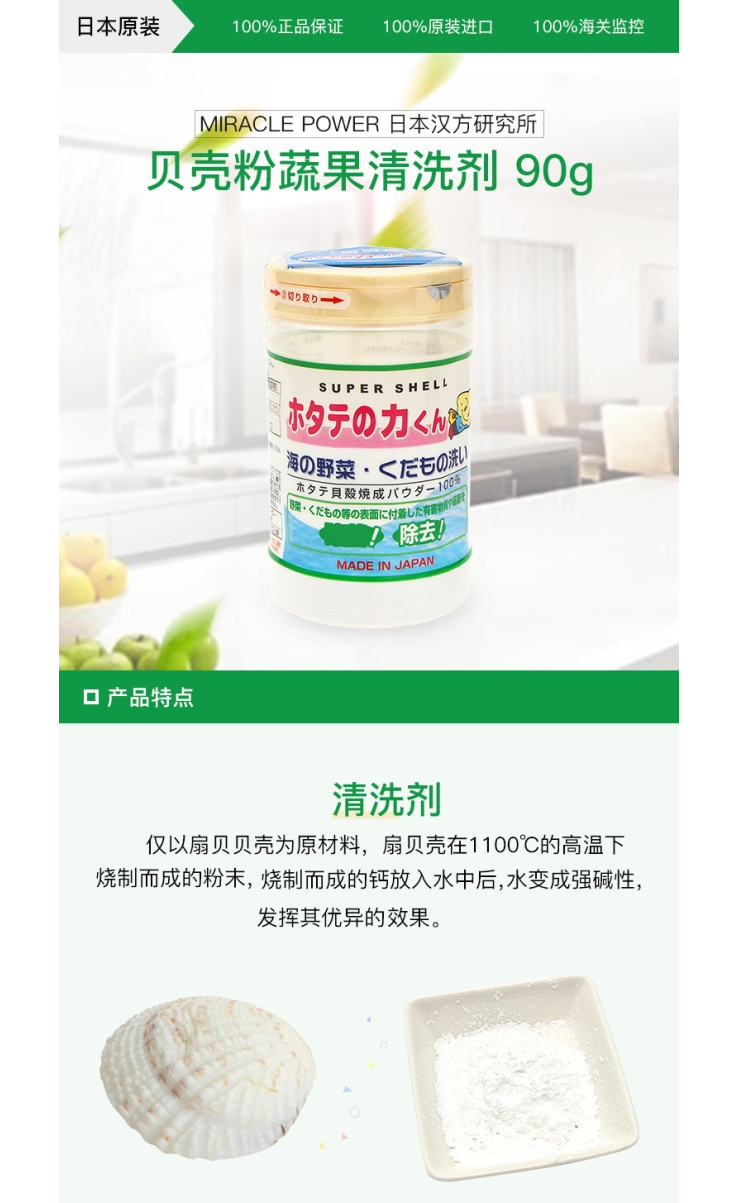 您所在的位置:首页 > 家居日用 >  生活日用 >  洗晒/熨烫 >  【日本直邮】MIRACLE POWER 日本汉方研究所 贝壳粉蔬果清洗剂洗菜粉 90g