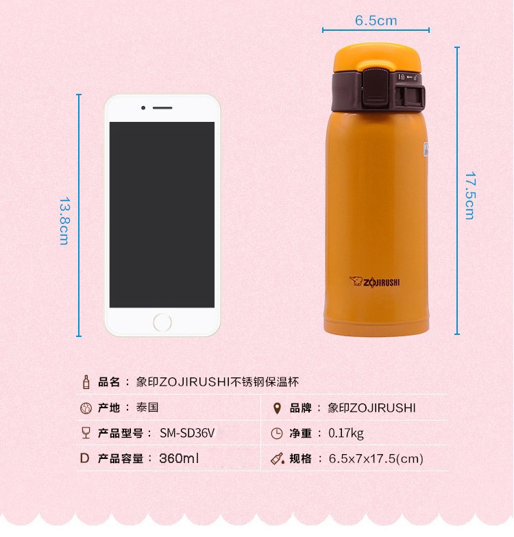 您所在的位置:首页 > 家居日用 >  水具酒具 >  保温杯 >  ZOJIRUSHI/象印 不锈钢保温杯 SM-SD48V 480ML 黄色
