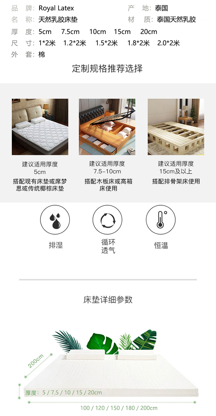 泰国进口Royal Latex皇家天然乳胶床垫Ⅰ-1 尺寸100×200×5㎝